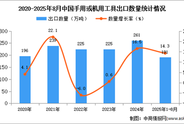 2025年1-8月中国手用或机用工具出口数据统计分析:出口量同比增长14.3%