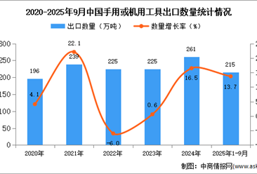 2025年1-9月中国手用或机用工具出口数据统计分析:出口量同比增长13.7%