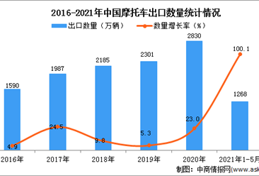 中商情报网讯:据中商产业研究院数据库显示,2021年1-5月中国摩托车出口量1268万辆,同比增长100.1%。 数据来源:中商产业研究院数据库 从金额方面来看,2021年1-5月摩托...【详情】