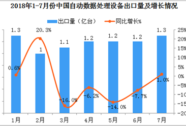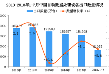 中商情报网讯:据中商产业研究院数据库显示,2014年-2017年中国自动数据处理设备出口量逐渐下降,2018年1-7月中国自动数据处理设备出口量为81095万台,同比下降5.8%。 ...【详情】