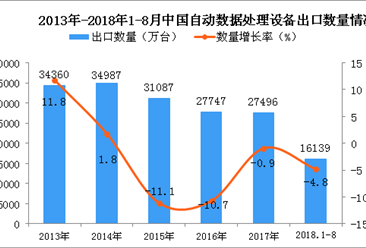 中商情报网讯:据中商产业研究院数据库显示,2014年-2017年中国自动数据处理设备出口量逐渐下降,2018年1-8月中国自动数据处理设备出口量为16139万台,同比下降4.8%。 ...【详情】