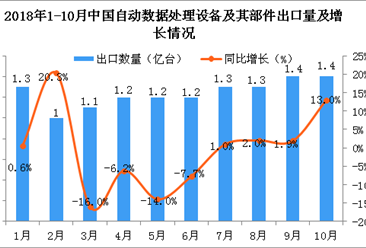 中商情报网讯:据中商产业研究院数据库显示,2018年2-10月中国自动数据处理设备及其部件出口量整体呈增长趋势,2018年10月中国自动数据处理设备及其部件出口量为1.4亿台,...【详情】