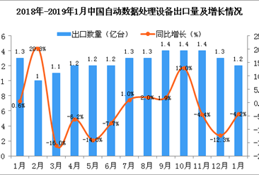 中商情报网讯:据中商产业研究院数据库显示,2018年1-4季度自动数据处理设备及其部件出口量稳步增长,2019年1月中国自动数据处理设备出口量持续下降,2019年1月中国自动数...【详情】