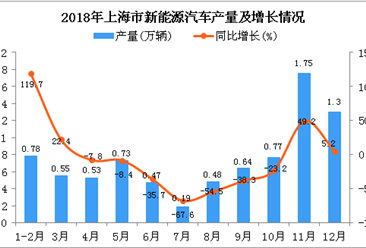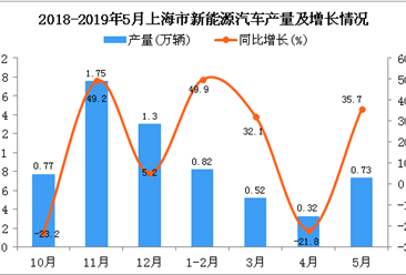 中商情报网讯:据中商产业研究院数据库显示,2019年5月上海市新能源汽车产量明显增长,2019年5月上海市新能源汽车产量为0.73万辆,同比增长35.7%。2019年1-5月上海市新能...【详情】