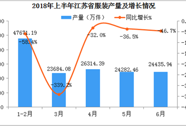 中商情报网讯:据中商产业研究院数据库显示,2018年4-5月江苏省服装产量有小幅度下降,2018年5月江苏省服装产量为24282.5万件,同比下降36.5%。2018年6-7月江苏省服装产量...【详情】