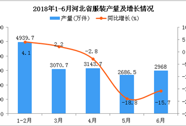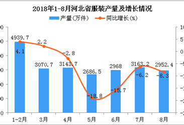 中商情报网讯:据中商产业研究院数据库显示,2018年3月-4月河北省服装产量有小幅度增长,2018年4月河北省服装产量为3143.7万件,同比下降2.8%。2018年5月河北省服装产量有...【详情】