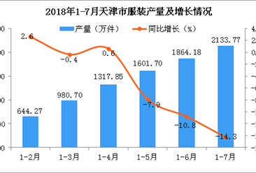 中商情报网讯:据中商产业研究院数据库显示,2018年1-7月天津市服装产量为2133.77万件,同比下降14.3%。 数据来源:中商产业研究院数据库 2014年-2016年天津市服装产量...【详情】