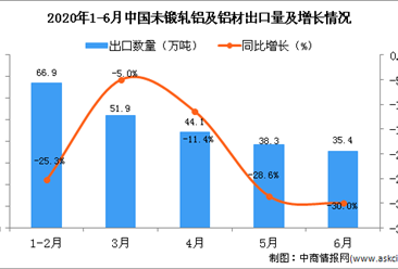 中商情报网讯:据中商产业研究院数据库显示,2020年6月中国未锻轧铝及铝材出口量下降,2020年6月中国未锻轧铝及铝材出口量为35.4万吨,同比下降30%。 数据来源:中商产...【详情】