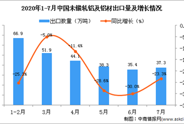 中商情报网讯:据中商产业研究院数据库显示,2020年7月中国未锻轧铝及铝材出口量增长,2020年7月中国未锻轧铝及铝材出口量为37.3万吨,同比下降23.3%。 数据来源:中商...【详情】