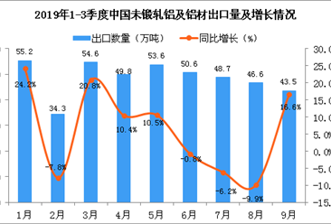 中商情报网讯:据中商产业研究院数据库显示,2019年1-2季度中国未锻轧铝及铝材出口量有小幅度增长,2019年8月中国未锻轧铝及铝材出口量为46.6万吨,同比下降9.9%。 数据...【详情】