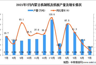 中商情报网讯:据中商产业研究院数据库显示,2021年7月内蒙古机制纸及纸板0.33万吨,同比下降54.8%。 数据来源:中商产业研究院数据库 2021年7月内蒙古机制纸及纸板增长...【详情】
