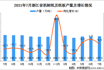中商情报网讯:据中商产业研究院数据库显示,2021年7月浙江省机制纸及纸板127.4万吨,同比下降4.5%。 数据来源:中商产业研究院数据库 2021年7月浙江省机制纸及纸板增长...【详情】