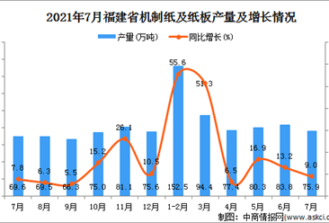 中商情报网讯:据中商产业研究院数据库显示,2021年7月福建省机制纸及纸板75.9万吨,同比增长9%。 数据来源:中商产业研究院数据库 2021年7月福建省机制纸及纸板增长情况...【详情】