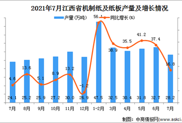 中商情报网讯:据中商产业研究院数据库显示,2021年7月江西省机制纸及纸板28.2万吨,同比增长16.8%。 数据来源:中商产业研究院数据库 2021年7月江西省机制纸及纸板增长...【详情】