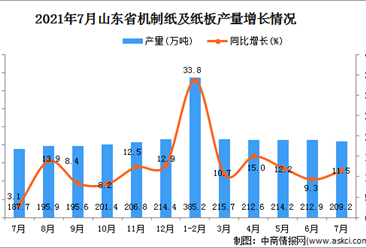 中商情报网讯:据中商产业研究院数据库显示,2021年7月山东省机制纸及纸板209.2万吨,同比增长11.5%。 数据来源:中商产业研究院数据库 2021年7月山东省机制纸及纸板增长...【详情】
