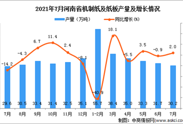 中商情报网讯:据中商产业研究院数据库显示,2021年7月河南省机制纸及纸板30.2万吨,同比增长2%。 数据来源:中商产业研究院数据库 2021年7月河南省机制纸及纸板增长情...【详情】