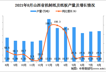 中商情报网讯:据中商产业研究院数据库显示,2021年8月河北省机制纸及纸板31.2万吨,同比增长13.3%。 数据来源:中商产业研究院数据库 2021年8月河北省机制纸及纸板增长...【详情】