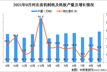 中商情报网讯:据中商产业研究院数据库显示,2021年9月河北机制纸及纸板38.3万吨,同比增长8.9%。 数据来源:中商产业研究院数据库 2021年9月河北机制纸及纸板增长情况 ...【详情】