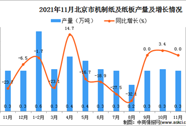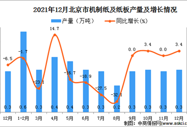 中商情报网讯:据中商产业研究院数据库显示,2021年北京机制纸及纸板产量5月出现下降,9月恢复增长。 2021年12月北京机制纸及纸板产量为0.3万吨,同比增长3.4%。2021年北...【详情】