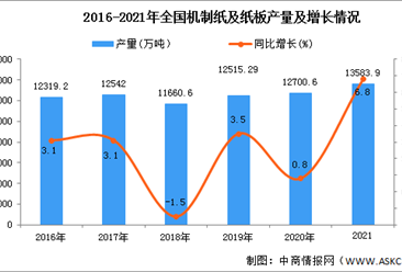 中商情报网讯:据中商产业研究院数据库显示,近年来全国机制纸及纸板产量持续增长,2021年达近年来产量最高值。 2021年12月全国机制纸及纸板产量为1234.4万吨,同比增长1....【详情】