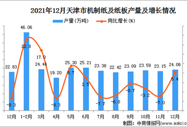 中商情报网讯:据中商产业研究院数据库显示,2021年天津机制纸及纸板每月产量波动小,12月平稳增长,全年同比增长。 2021年12月天津机制纸及纸板产量为24.06万吨,同比增...【详情】