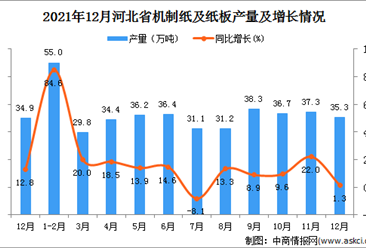 中商情报网讯:据中商产业研究院数据库显示,2021年12月河北机制纸及纸板产量较上月下降,全年产量同比增长。 2021年12月河北机制纸及纸板产量为35.3万吨,同比增长1.3%。...【详情】