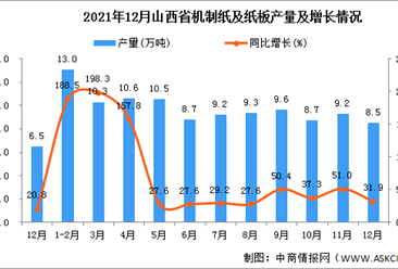 中商情报网讯:据中商产业研究院数据库显示,2021年12月山西省机制纸及纸板产量较上月下降,全年产量同比增长。 2021年12月山西省机制纸及纸板产量为8.5万吨,同比增长31....【详情】