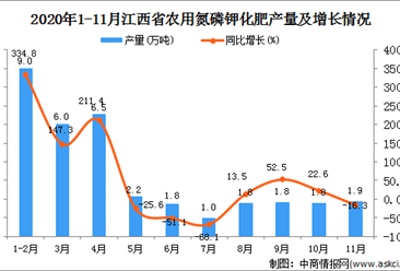 中商情报网讯:据中商产业研究院数据库显示,2020年11月江西省农用氮磷钾化肥产量为1.9万吨,同比下降16.3%。 数据来源:中商产业研究院数据库 2020年11月江西省农用氮...【详情】