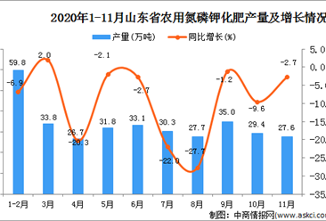 中商情报网讯:据中商产业研究院数据库显示,2020年11月山东省农用氮磷钾化肥产量为27.6万吨,同比下降2.7%。 数据来源:中商产业研究院数据库 2020年11月山东省农用氮...【详情】
