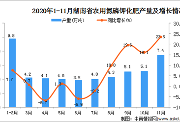 中商情报网讯:据中商产业研究院数据库显示,2020年11月湖南省农用氮磷钾化肥产量为7.4万吨,同比增长23.5%。 数据来源:中商产业研究院数据库 2020年11月湖南省农用氮...【详情】
