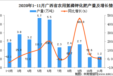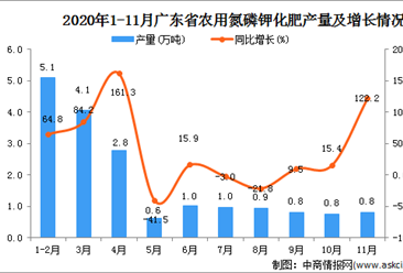 中商情报网讯:据中商产业研究院数据库显示,2020年11月广东省农用氮磷钾化肥产量为0.8万吨,同比增长122.2%。 数据来源:中商产业研究院数据库 2020年11月广东省农用氮...【详情】