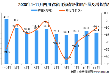 中商情报网讯:据中商产业研究院数据库显示,2020年11月四川省农用氮磷钾化肥产量为30.4万吨,同比下降10.4%。 数据来源:中商产业研究院数据库 2020年11月四川省农用氮...【详情】