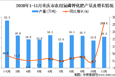 中商情报网讯:据中商产业研究院数据库显示,2020年11月重庆市农用氮磷钾化肥产量为15.3万吨,同比增长257.5%。 数据来源:中商产业研究院数据库 2020年11月重庆市农用...【详情】