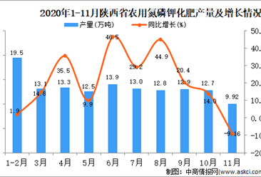 中商情报网讯:据中商产业研究院数据库显示,2020年11月陕西省农用氮磷钾化肥产量为9.92万吨,同比下降9.16%。 数据来源:中商产业研究院数据库 2020年11月陕西省农用氮...【详情】