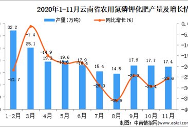 中商情报网讯:据中商产业研究院数据库显示,2020年11月云南省农用氮磷钾化肥产量为17.4万吨,同比下降25.6%。 数据来源:中商产业研究院数据库 2020年11月云南省农用氮...【详情】