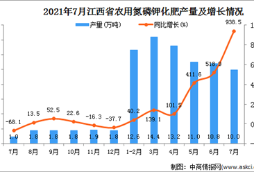 中商情报网讯:据中商产业研究院数据库显示,2021年7月江西省农用氮磷钾化肥10万吨,同比增长938.5%。 数据来源:中商产业研究院数据库 2021年7月江西省农用氮磷钾化肥增...【详情】