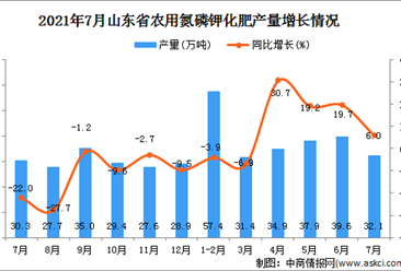 中商情报网讯:据中商产业研究院数据库显示,2021年7月山东省农用氮磷钾化肥32.1万吨,同比增长6%。 数据来源:中商产业研究院数据库 2021年7月山东省农用氮磷钾化肥增长...【详情】