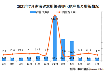 中商情报网讯:据中商产业研究院数据库显示,2021年7月湖南省农用氮磷钾化肥3.8万吨,同比下降4.7%。 数据来源:中商产业研究院数据库 2021年7月湖南省农用氮磷钾化肥增...【详情】