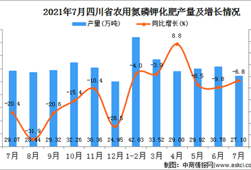 中商情报网讯:据中商产业研究院数据库显示,2021年7月四川省农用氮磷钾化肥27.1万吨,同比下降6.8%。 数据来源:中商产业研究院数据库 2021年7月四川省农用氮磷钾化肥...【详情】