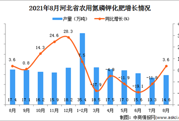 中商情报网讯:据中商产业研究院数据库显示,2021年8月河北省农用氮磷钾化肥14.6万吨,同比下降3.6%。 数据来源:中商产业研究院数据库 2021年8月河北省农用氮磷钾化肥...【详情】