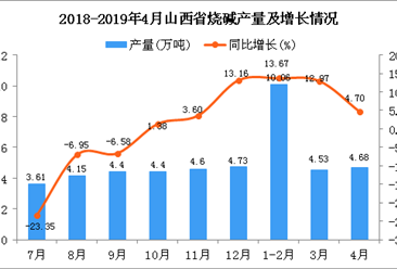 中商情报网讯:据中商产业研究院数据库显示,2018年3-4季度山西省烧碱产量呈小幅度增长,2019年4月山西省烧碱产量为4.68万吨,同比增长4.7%。2019年1-4月山西省烧碱产量为...【详情】
