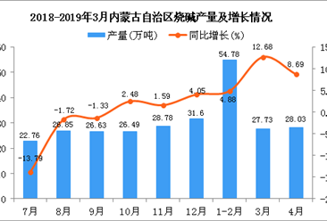 中商情报网讯:据中商产业研究院数据库显示,2018年3-4季度蒙古自治区烧碱产量呈增长趋势,2019年4月内蒙古自治区烧碱产量为28.03万吨,同比增长8.69%。2019年1-4月蒙古自...【详情】