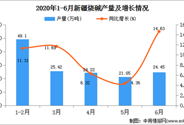 中商情报网讯:据中商产业研究院数据库显示,2020年6月新疆烧碱产量增加,2020年6月新疆烧碱产量为24.45万吨,同比增长14.63%。2020年1-6月新疆烧碱产量为143.02万吨,同...【详情】