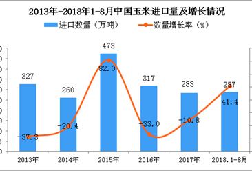 中商情报网讯:据中商产业研究院数据库显示,2015年-2017年中国玉米的进口量逐渐下降,2018年1-8月中国玉米进口量为287万吨,同比增长41.4%。 数据来源:中商产业研究院...【详情】