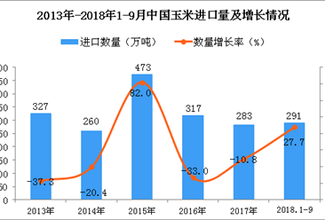 中商情报网讯:据中商产业研究院数据库显示,2015年-2017年中国玉米的进口量逐渐下降,2017年中国玉米进口量为283万吨,同比下降10.8%。2018年1-9月中国玉米进口量为291万...【详情】