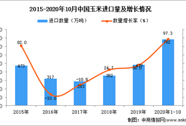 中商情报网讯:据中商产业研究院数据库显示,2020年1-10月中国玉米进口量上升,2020年1-10月中国玉米进口量为782万吨,同比增长97.3%。 数据来源:中商产业研究院数据库...【详情】