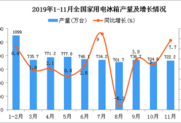 中商情报网讯:据中商产业研究院数据库显示,2019年1-3季度全国家用电冰箱产量波动幅度不大,2019年11月全国家用电冰箱产量为722.2万台,同比增长7.7%。2019年1-11月全国...【详情】