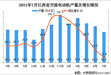 中商情报网讯:据中商产业研究院数据库显示,2021年7月江西省交流电动机53.2万千瓦,同比下降6.9%。 数据来源:中商产业研究院数据库 2021年7月江西省交流电动机增长情况...【详情】