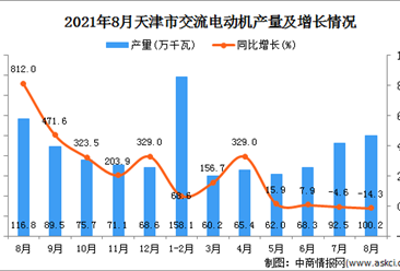 中商情报网讯:据中商产业研究院数据库显示,2021年8月天津市交流电动机100.2万千瓦,同比下降14.3%。 数据来源:中商产业研究院数据库 2021年8月天津市交流电动机增长...【详情】