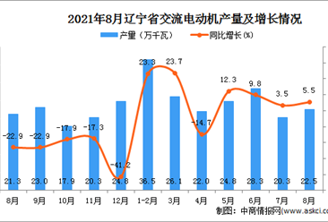 中商情报网讯:据中商产业研究院数据库显示,2021年8月辽宁交流电动机22.5万千瓦,同比增长5.5%。 数据来源:中商产业研究院数据库 2021年8月辽宁交流电动机增长情况 ...【详情】
